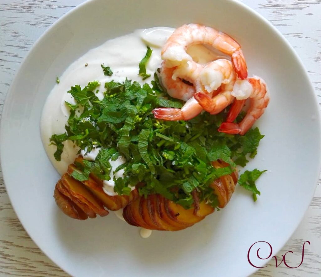 Spalten auseinanderdrücken, in die Zwischenräume Salz streuen und etwas Olivenöl träufeln und Thymianblätter einstreuen bei 200 Grad Unter-und Oberhitze ca. 60 min. garen zwischenzeitlich saure Sahne mit Himalayasalz und buntem Pfeffer würzen Knoblauchsrauke klein schneiden die Kartoffeln aus dem Backofen nehmen, saure Sahne dazu geben und Knoblauchsrauke darüber streuen als Verfeinerung/Ergänzung können Crevetten dazu gereicht werden.